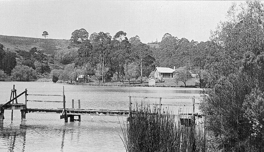 Jubilee Lake at Daylesford. There is a small jetty in the foreground. There are many trees surrounding the area.