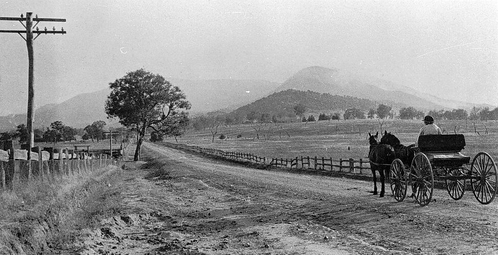 A horse and cart on a country road. There is a long wooden fence on either side of the road and there are poles to the left.