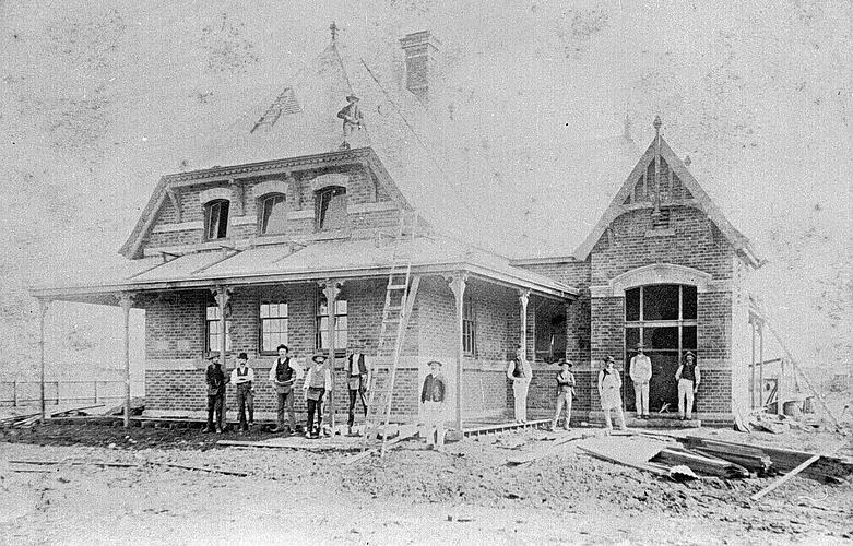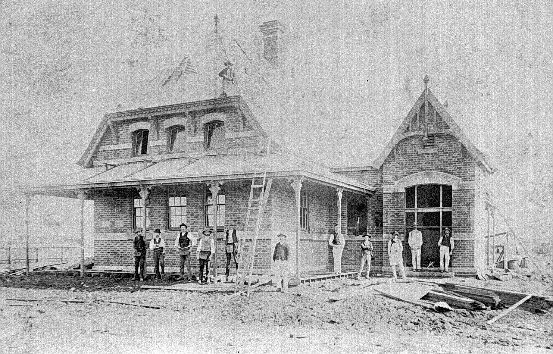 Workers in front of a building under construction. The building has a verandah and a chimney, and there is a large ladder resting against the verandah.