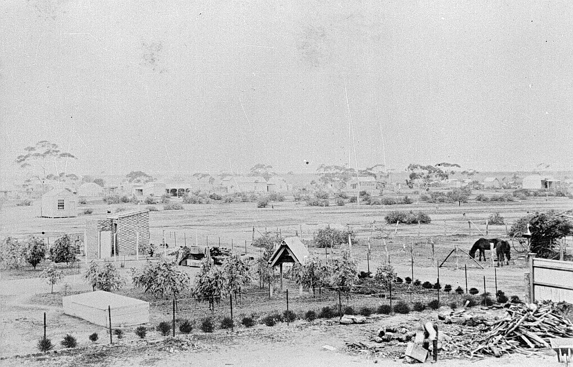 A man, identified as P. Clark, bootmaker, is chopping wood in the foreground there are gardens and buildings in the background. The gardens are surrounded by a wire fence.