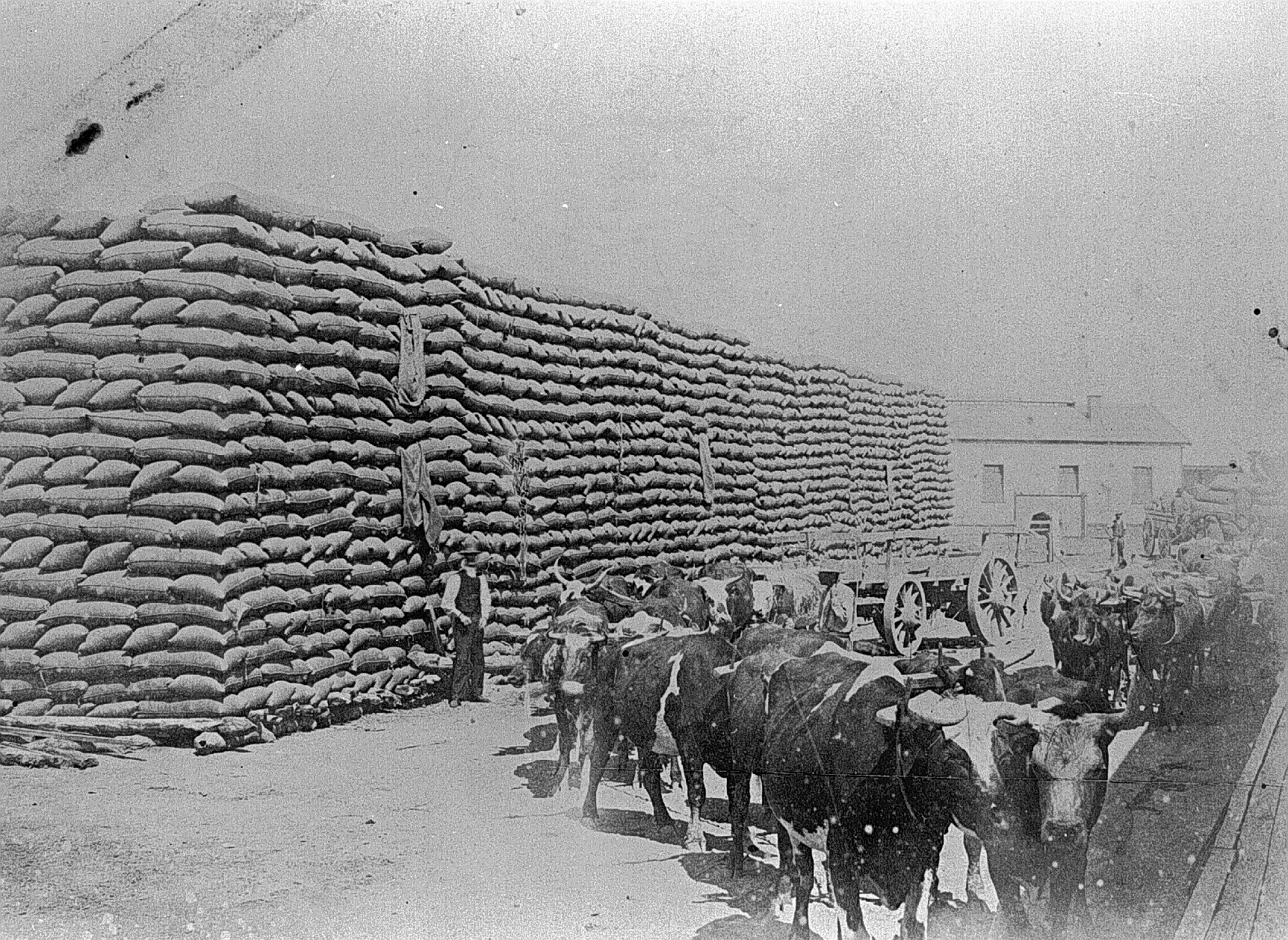 Bags (26,000) of grain stacked. Bullock teams unloading further loads.
