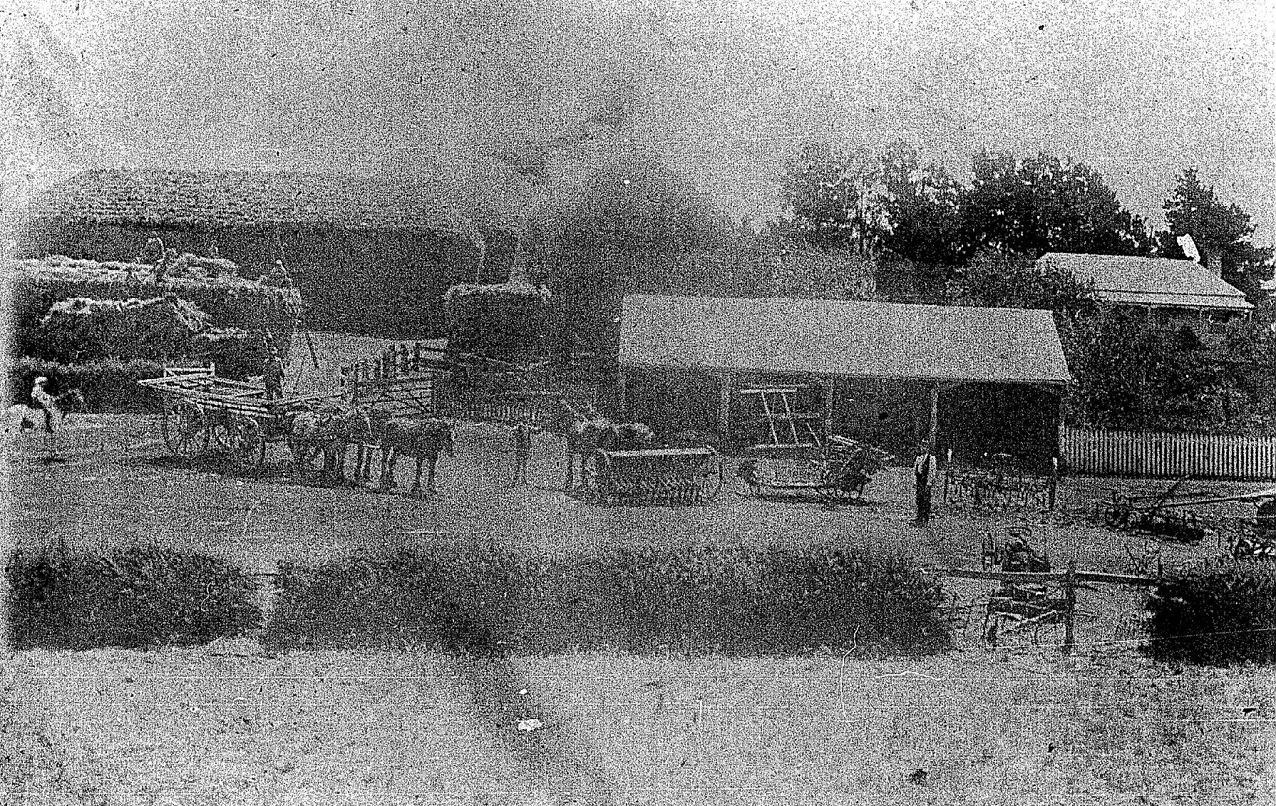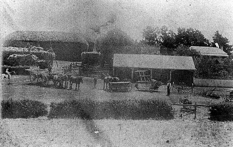Agricultural Equipment, Agricultural Workers, Carriages, Farms, Haystacks, Horses, Picket Fences