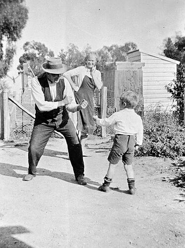 A man sparring with a small boy. A woman watches, laughing. There is an outside toilet in the background.