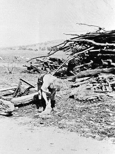 A boy with a rabbit which he has trapped. Beside him is a sled used to drag wood down the hillside.