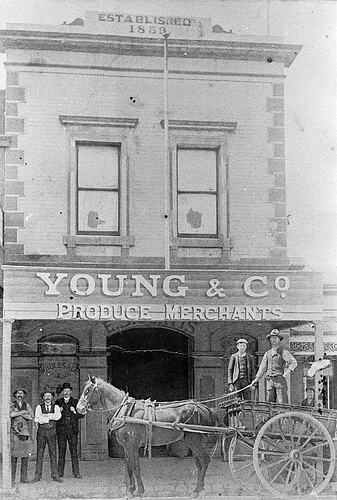 Staff outside the Young & Company, produce merchants store in Peel Street. A man and a boy stand on a horse drawn dray in front of the building.