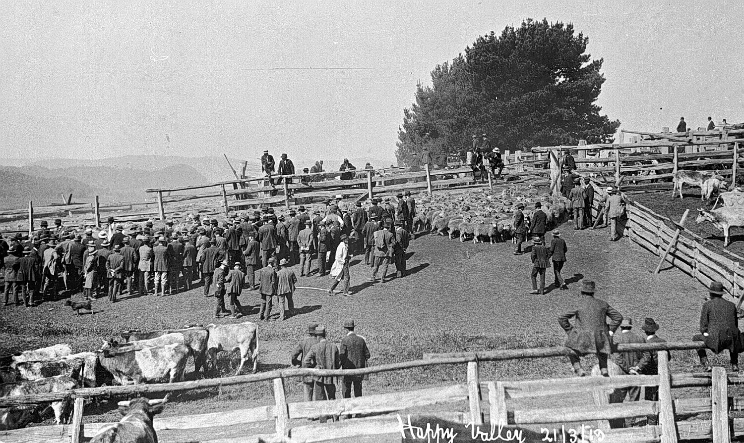 Clearing sale in stockyards at 'Happy Valley' homestead.