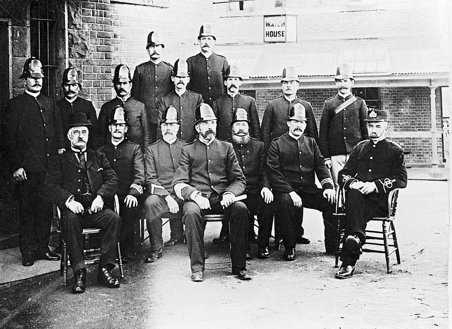 Policemen at the Ballarat Police Station. The police cell is on the left and the watch house at the rear.
