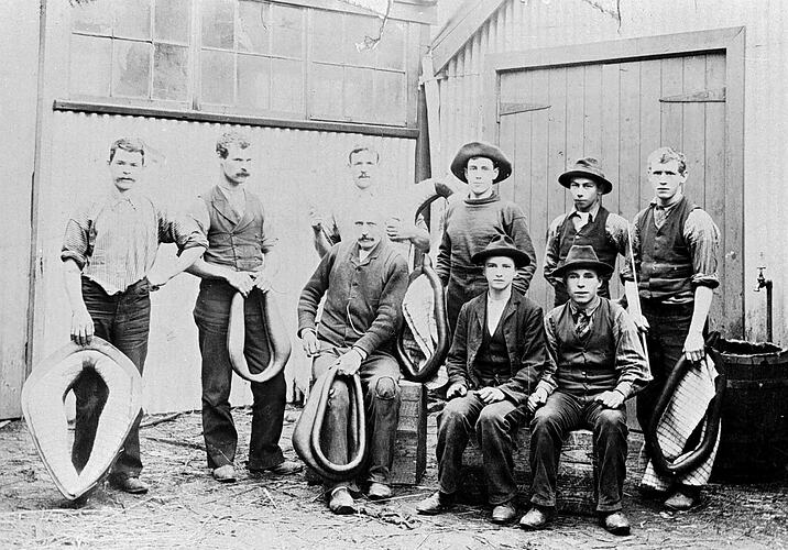 Workers outside the W. Clegg collar factory. The man on the left holds a heavy plough collar and the man next to him a Yankee collar.
