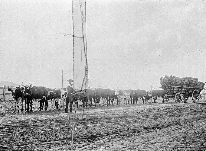 Bullock Drivers, Bullock Teams, Carriages, Cattle, Drays & Wagons, Farm Animals, Logging, Timber, Whips, Workers