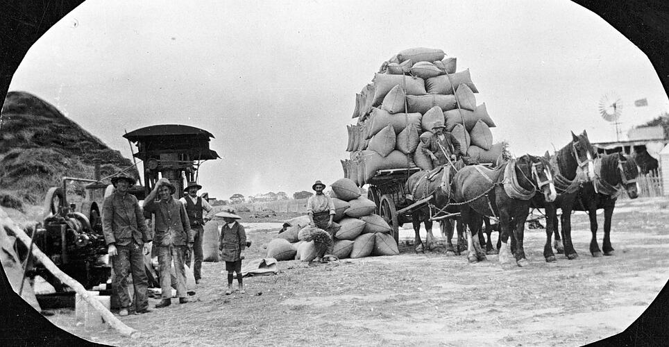 The Gillett family with a chaff cutter and their horse team. The horse team is yoked to a wagon laden with sacks.