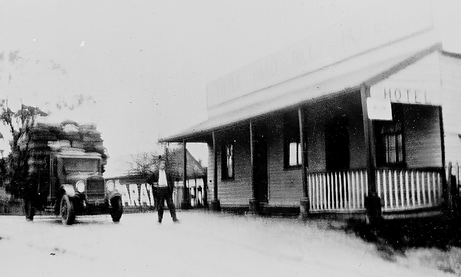 George Gillett 's truck stacked with charcoal bags outside the hotel at Little Hard Hills.