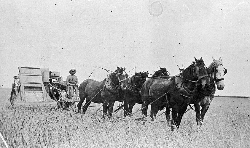 Charlie Gillett and his horses harvesting grain.