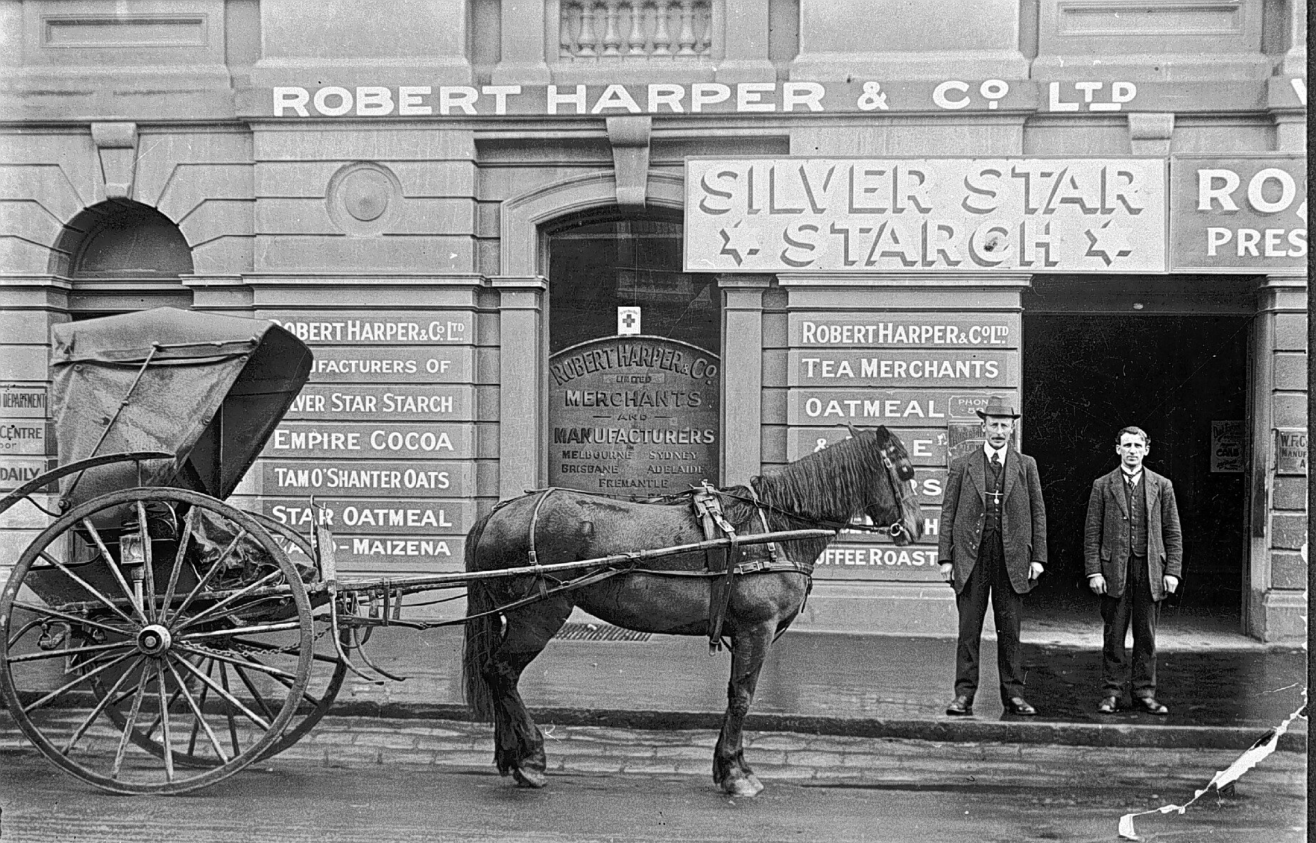 Two men and a horse and buggy outside the depot of Robert Harper & Company Limited.