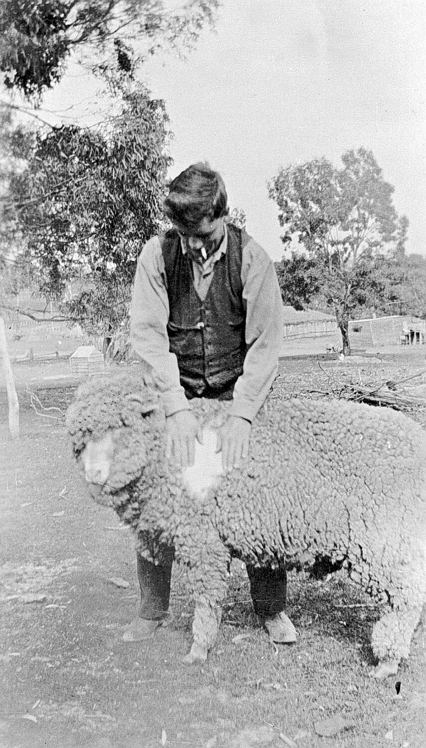 Man demonstrating the fleece on a sheep.