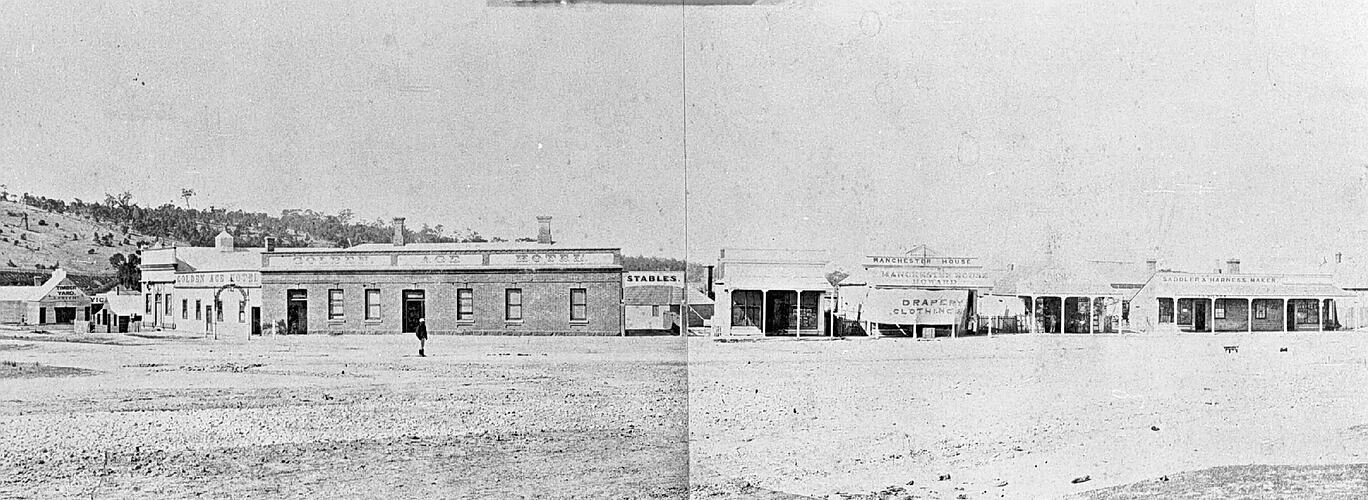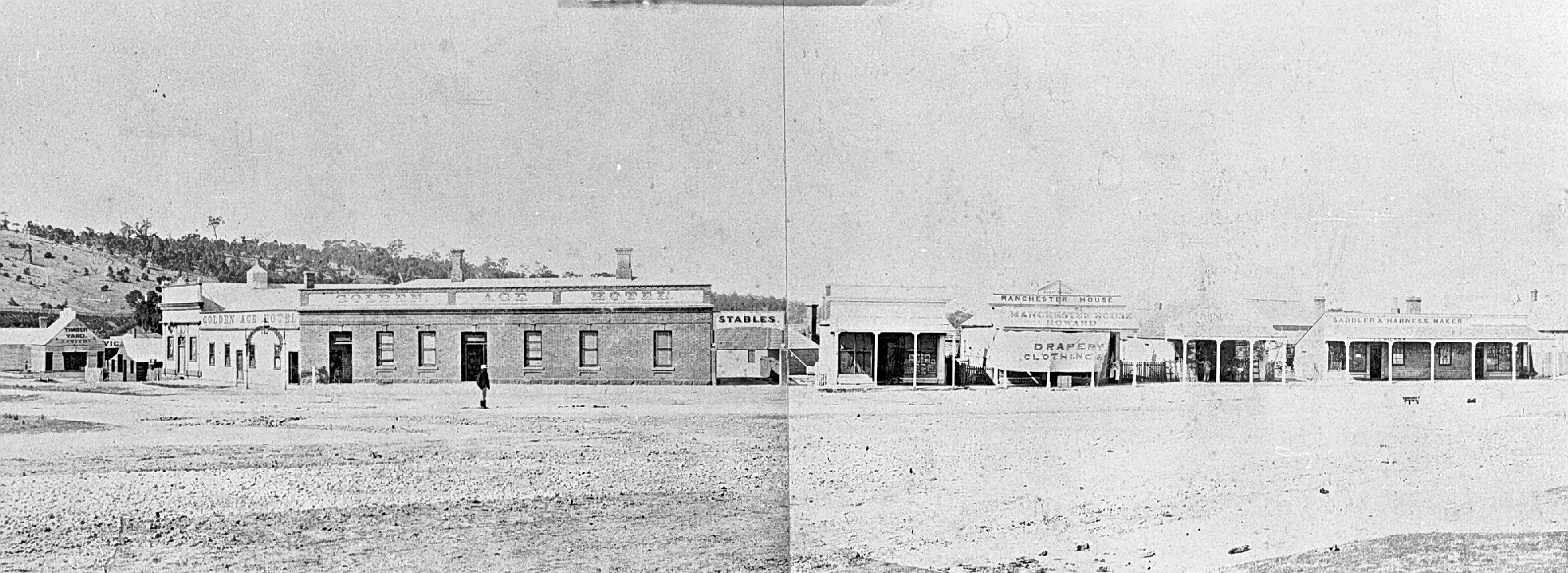 A panoramic view of the main street in Beaufort. The Golden Age Hotel is on the left.