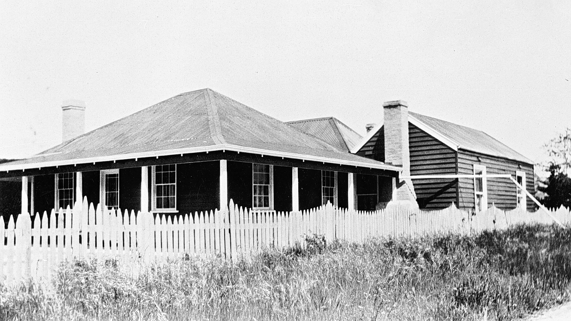 A house with verandah and with extensions to the back. There is tall grass in front of the picket fence.