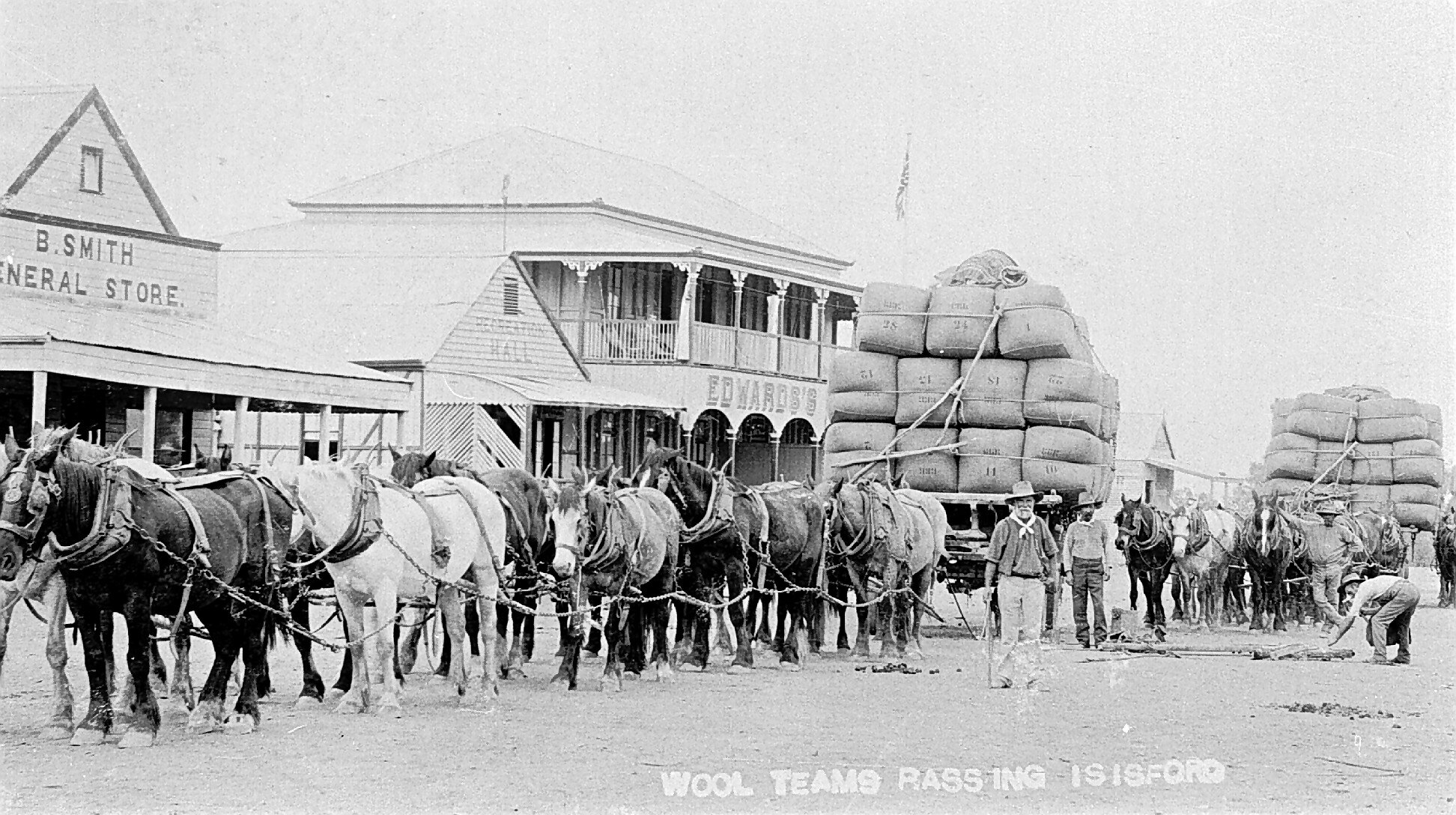 Horse teams pulling drays loaded with wool bales. In the background: Edward 's Club Hotel and the Isisford Recreation Hall.