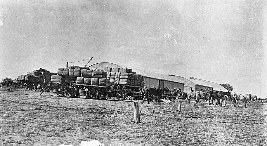 Agricultural Produce, Agricultural Workers, Drays & Wagons, Farms, Horsedrawn Vehicles, Horses, Shearing Sheds, Winches, Wool Bales, Workers
