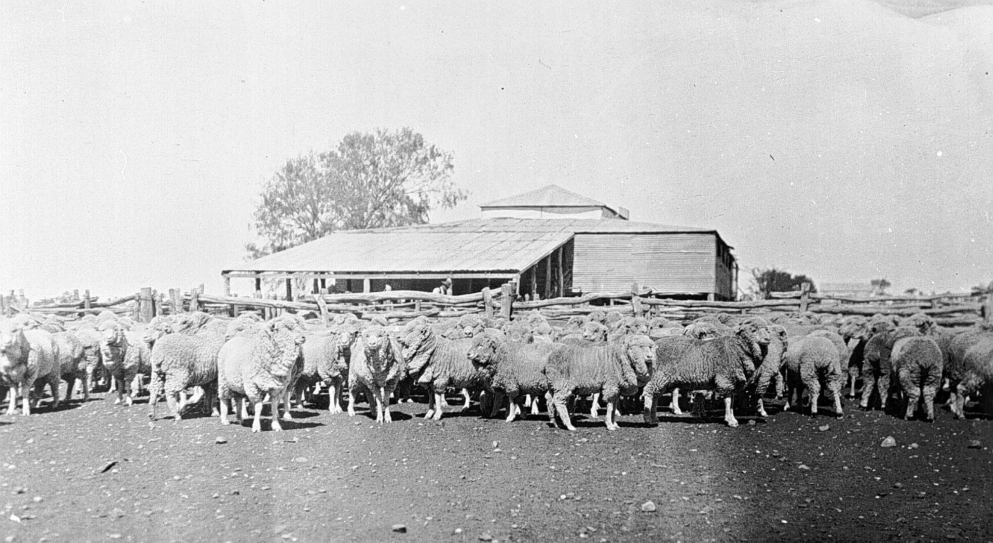 A large mob of sheep in a yard on 'Portland Downs' station.