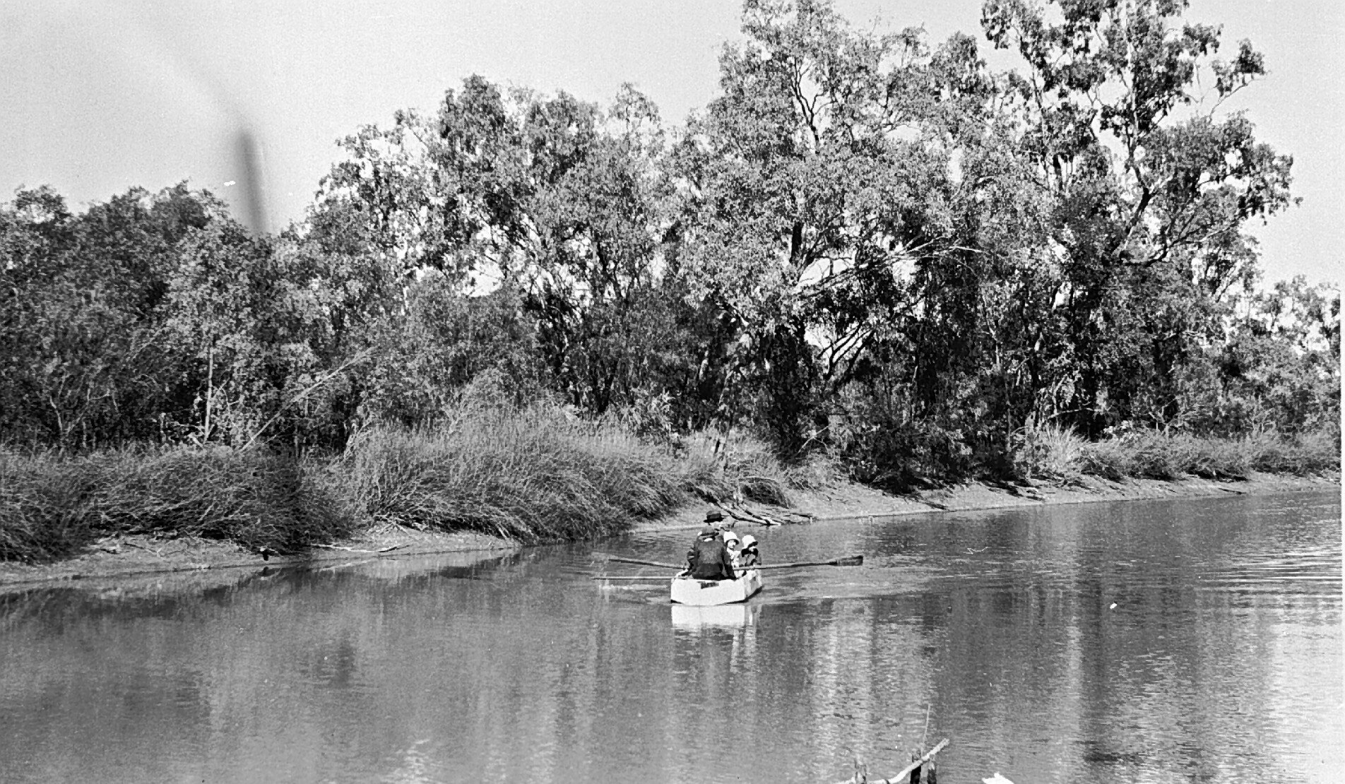 People in a rowboat on the Barcoo River on 'Portland Downs' station.
