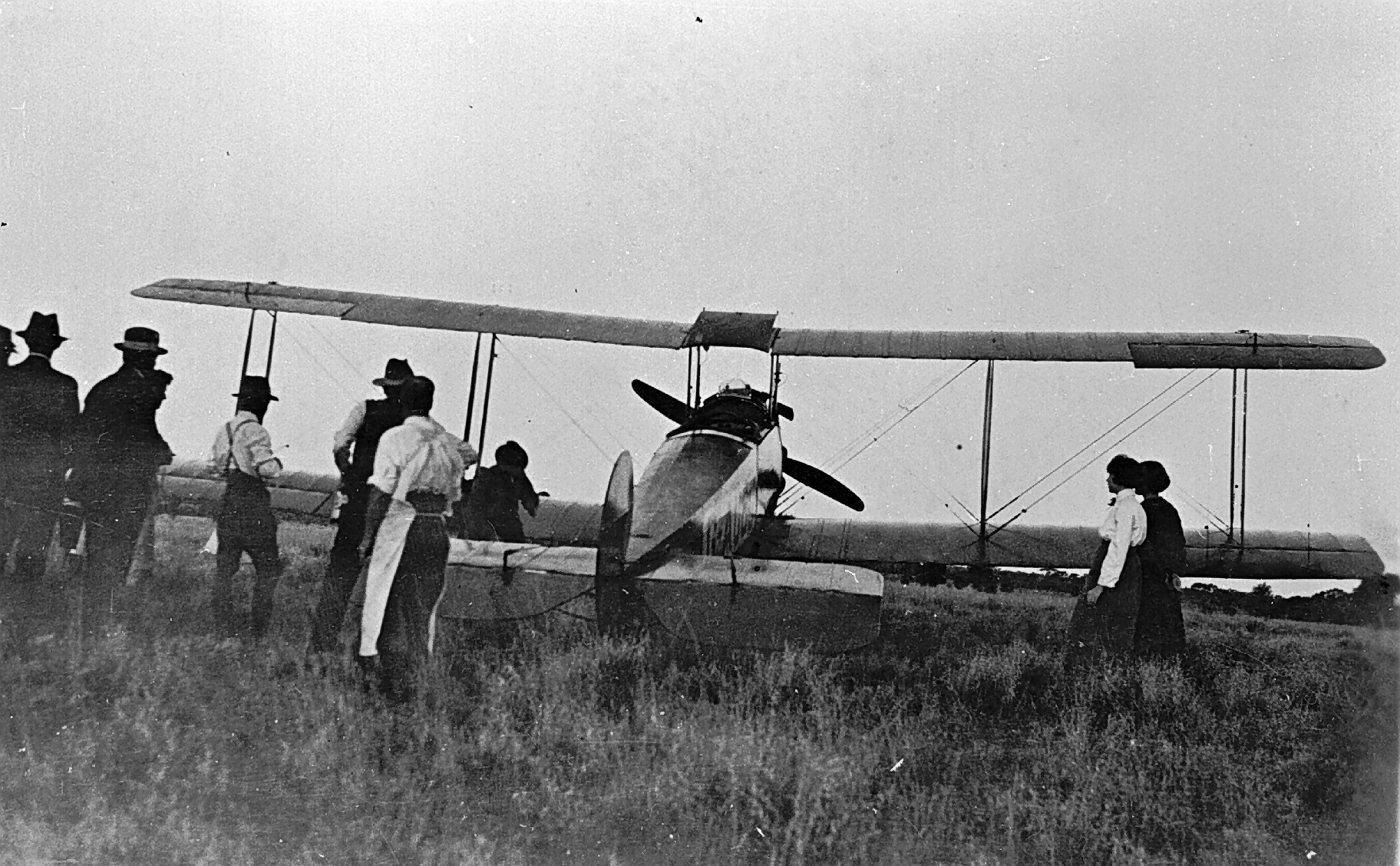 A small group of bystanders looking at an aircraft, an Avro 504, Believed to be a Qantas machine