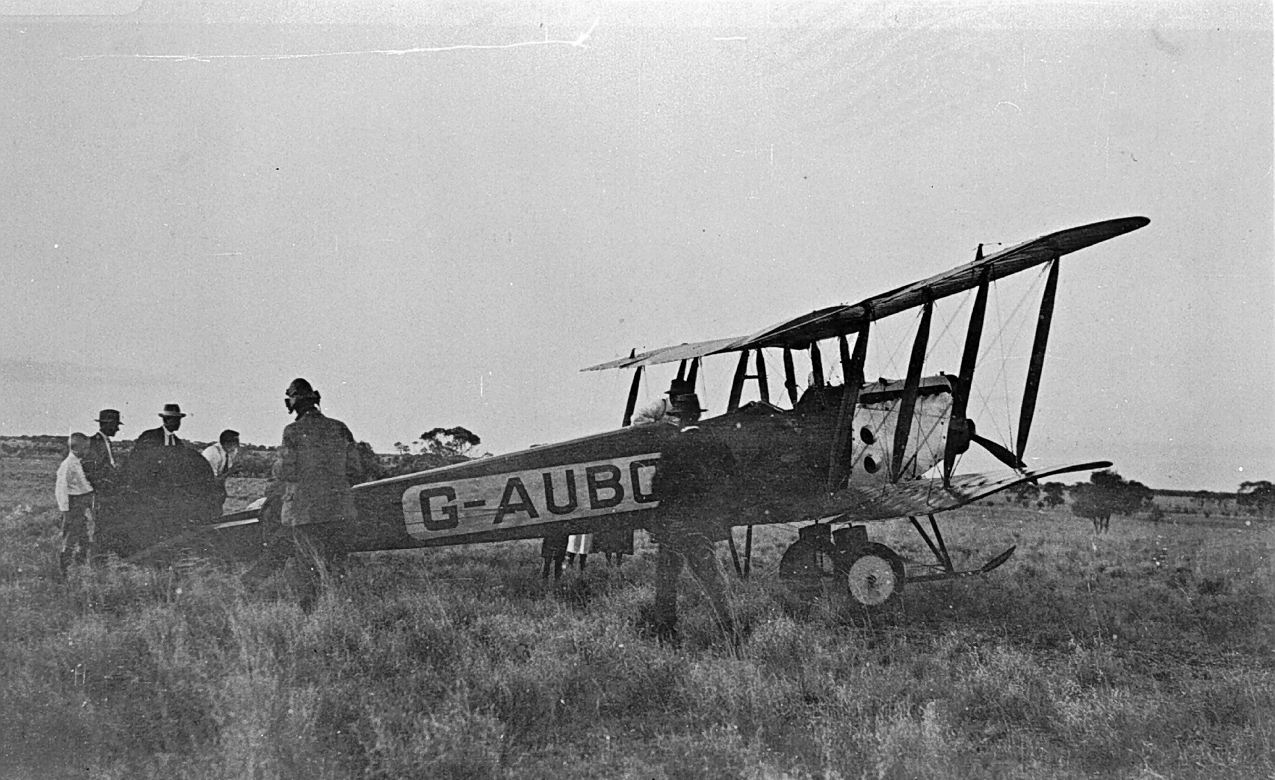 A small group of bystanders looking at a biplane. The Avro 504 aircraft is fitted with an inline Sunbeam Dyak engine and carries the civil registration 'G-AUBG', owned by Queensland & Northern Territory Aerial Services (Qantas)
