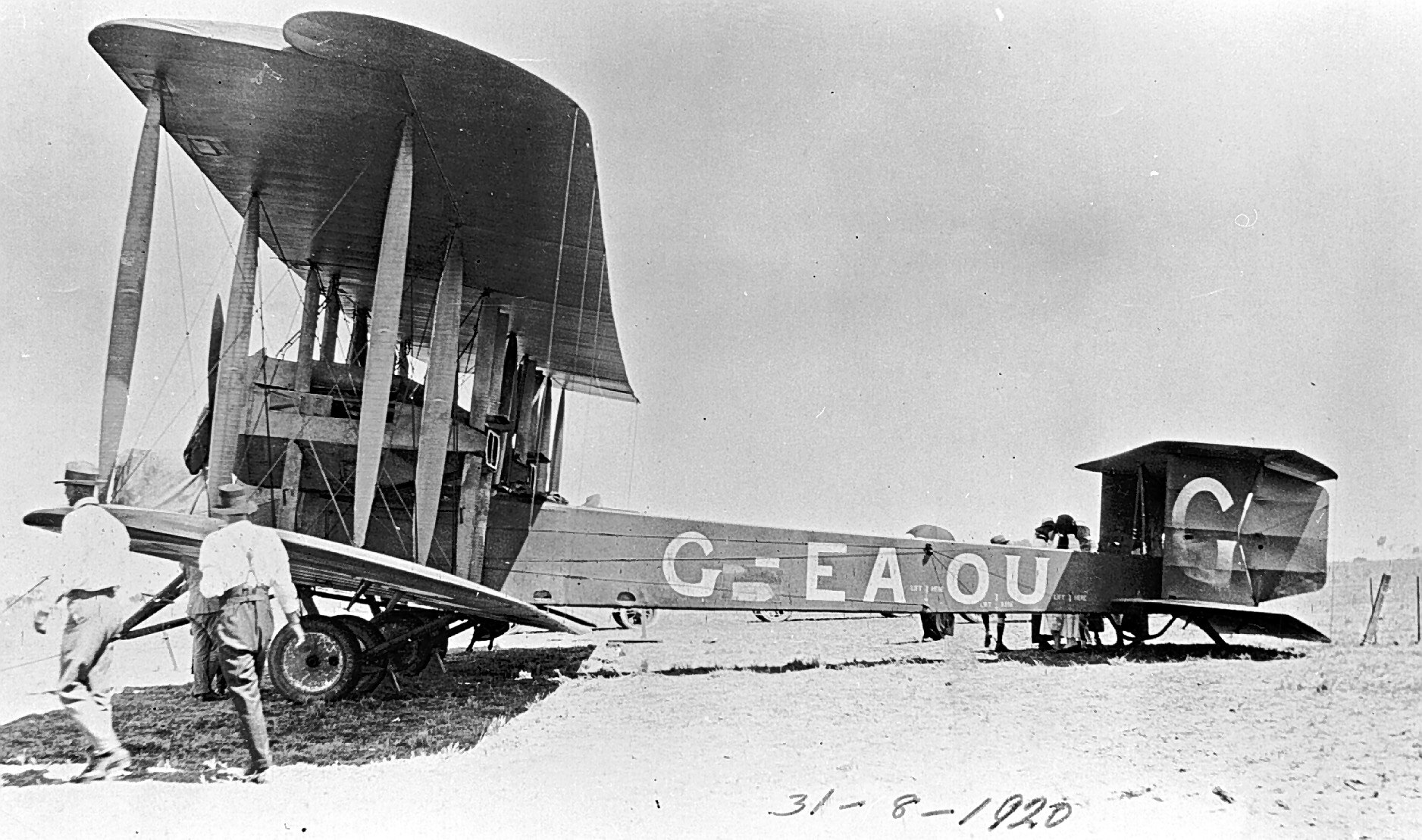 The Vickers Vimy aircraft flown by Sir Keith Smith. (The registration, G-EAOU, was popularly supposed to mean 'God 'Elp All Of Us').