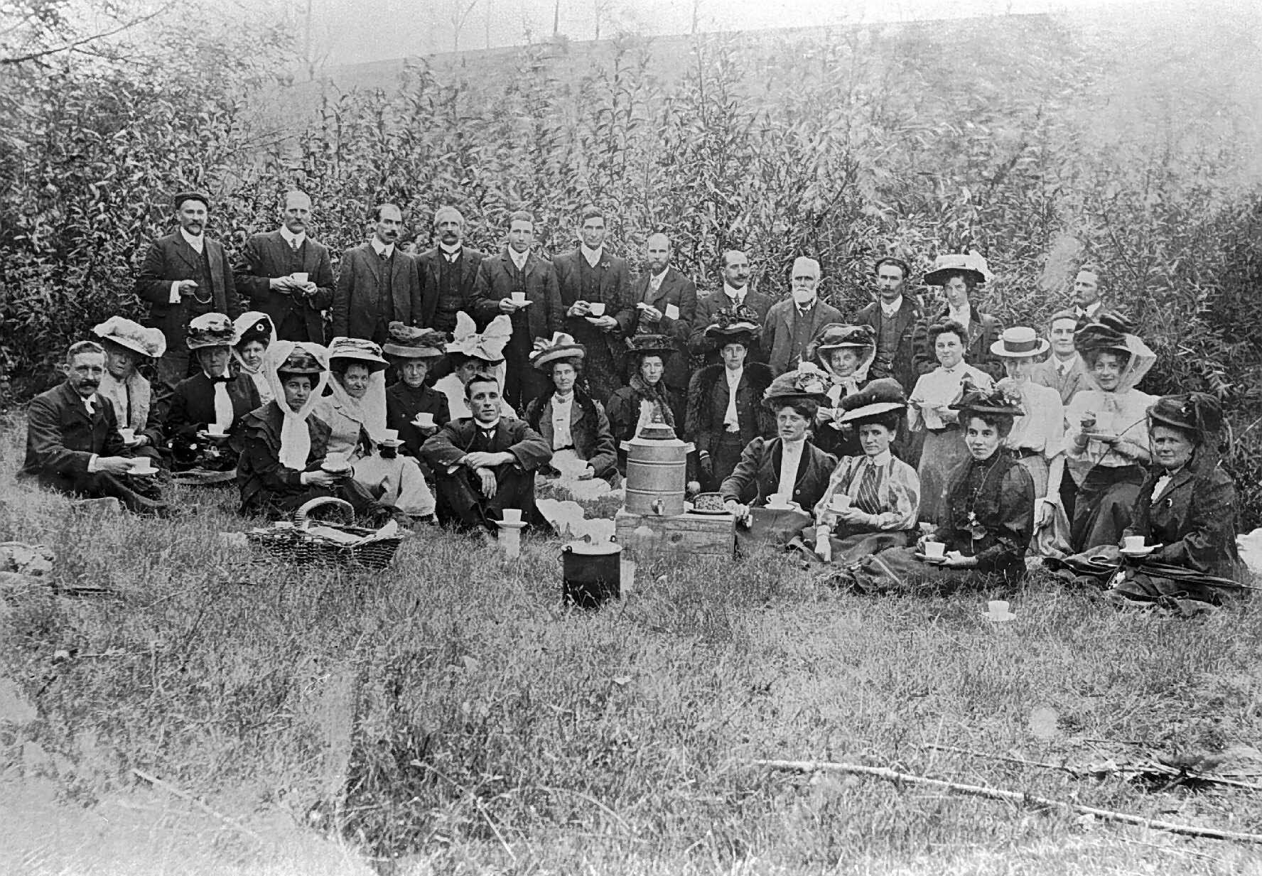A group of men and women, all quite formally attired, at a picnic in the bush.