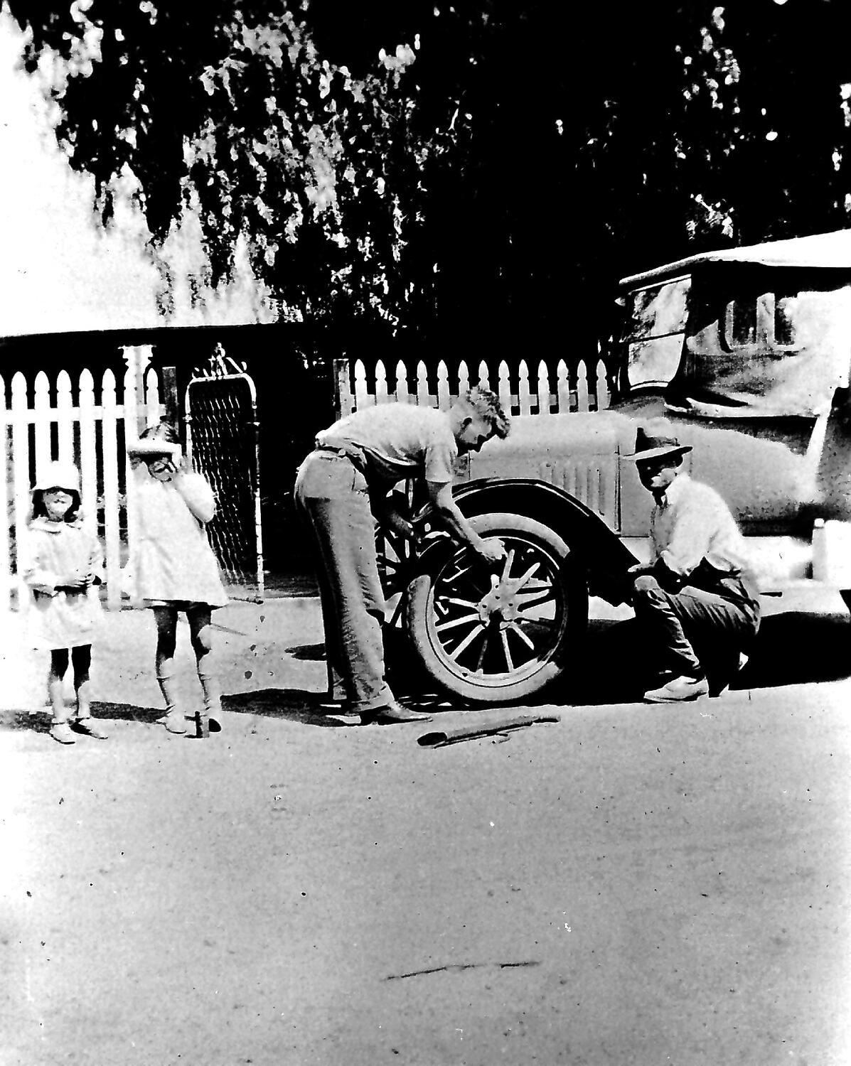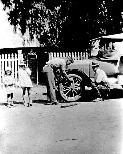 Two men changing a tyre. Two small girls are watching.