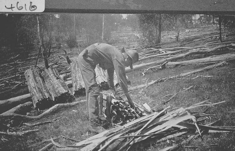 Binding bundles of wattle bark for the local tannery. A rural worker is standing bent over as he attaches a bundle of wattle bark to a frame resting on the ground, which appears to be a primitive form of back pack for carrying the bark out of the forest. Nearby are five neatly tied bundles of bark leaning against a fallen tree trunk. In the background is a semi-cleared area of open forest with numerous small dead trees and saplings lying on the ground against the hillside - possibly reflecting destruction by a past bushfire.