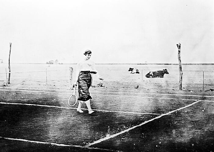 A woman playing tennis. It was her wedding day, she was married at home and the guests played tennis thereafter.