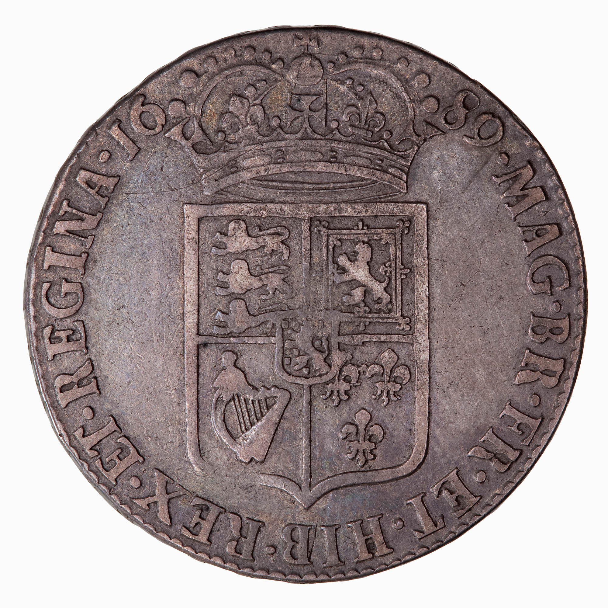 The first type crowned Royal shield (first quarter arms of England fourth quarter the arms of France), caul frosted, no pearls; around, MAG BR FR ET HIB REX ET REGINA; the crown divides the date 1789.