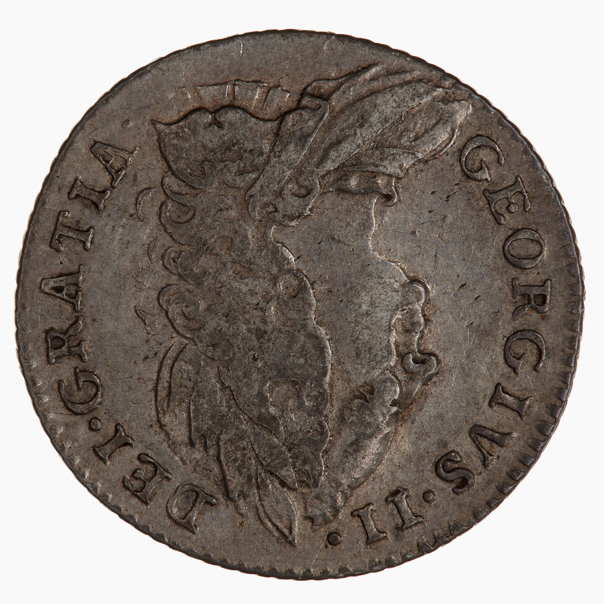 Old laureate bust of George II facing left wearing armour, with lion's head on shoulder; around, GEORGIVS II DEI GRATIA.