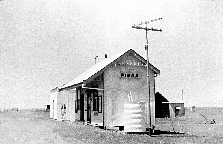 The Pimba Post Office. There is a water tank beside the post office and a telegraph pole.
