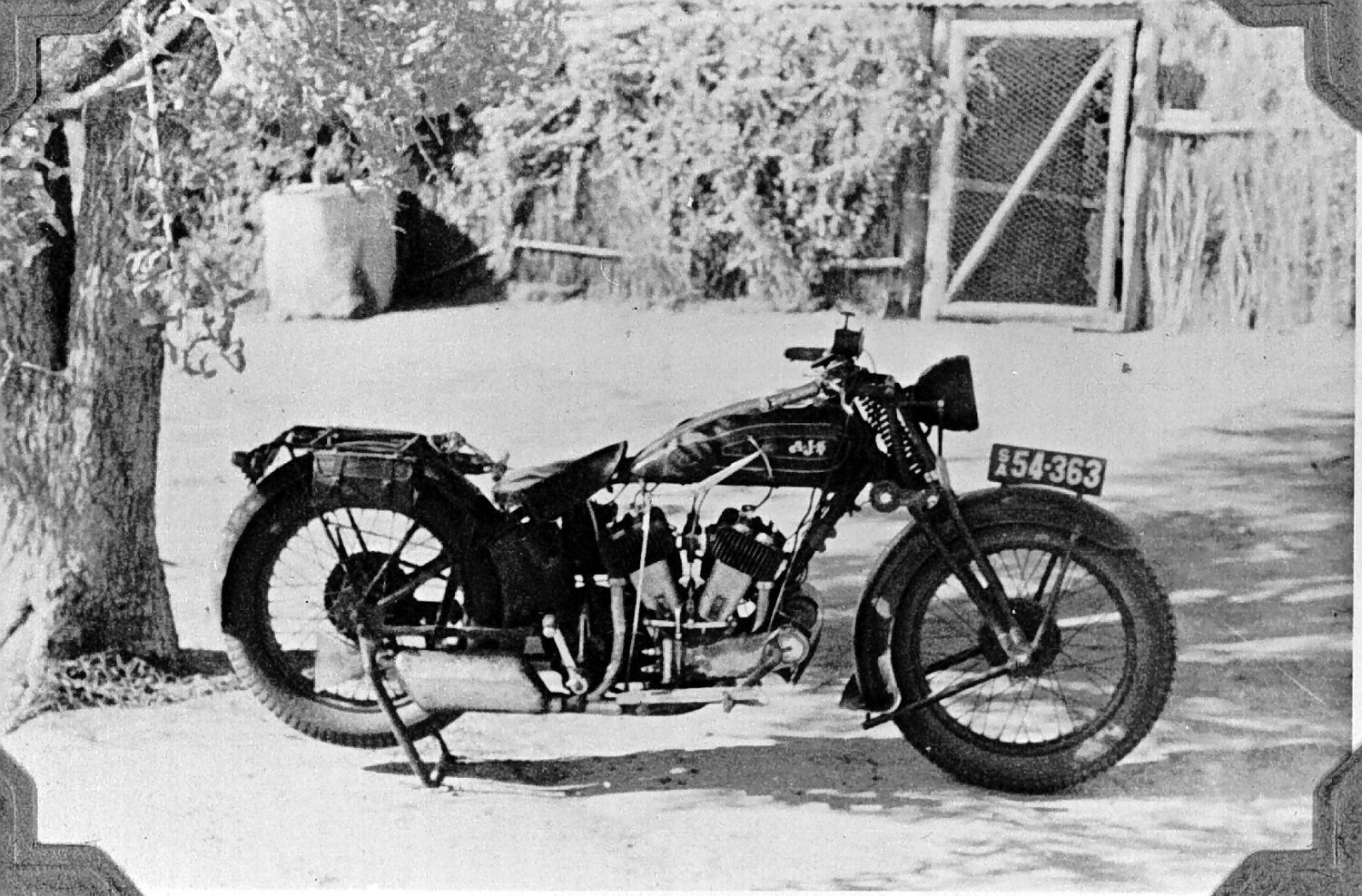 A AJS V-twin motorbike at 'Henbery' station. There is a brush covered building in the background.
