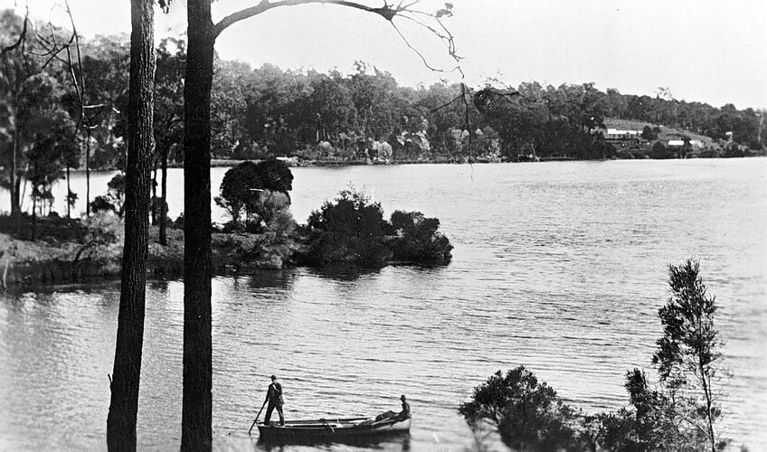 The Genoa River and Gypsy Point. There are two men in a rowboat.