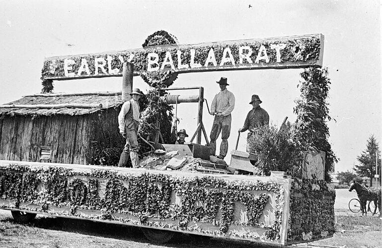 A float depicting early Ballarat in a street procession. 'Golden City' is picked out in flowers on the side of the float and a sign above the float reads'early Ballarat.' This may have been part of the centenary celebrations in 1938.
