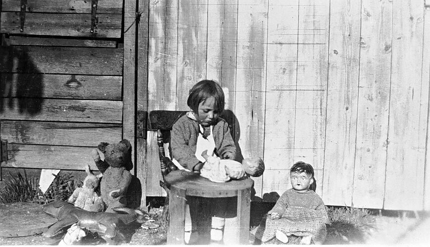 A small girl with dolls and a teddy bear seated at a small table in a backyard.