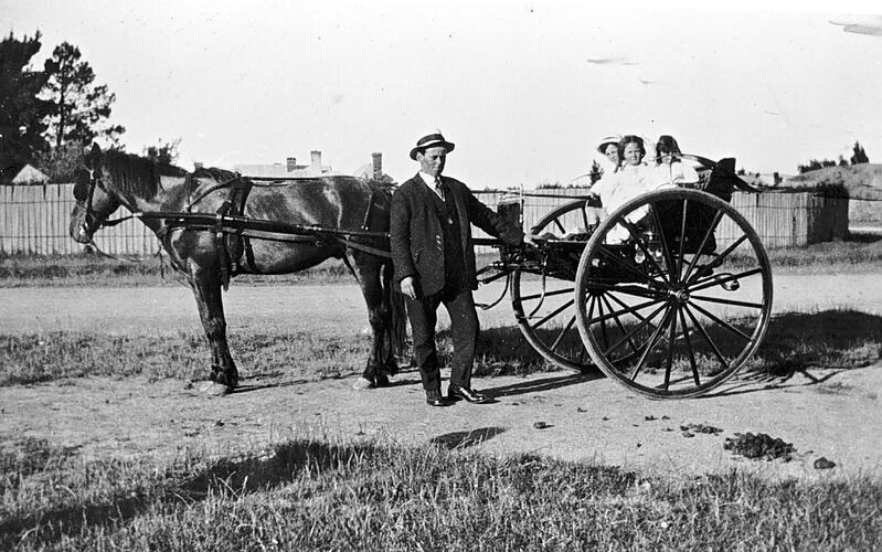 A man wearing a suit and hat standing by a horse and buggy. There are three small children in the buggy.