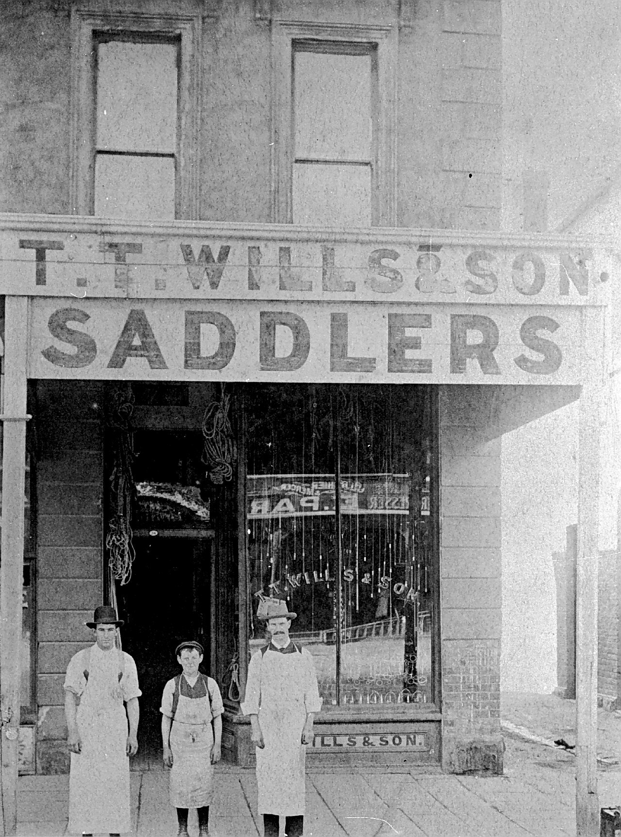 Shop staff, two men and a young boy, outside T. Wills & Son, Saddlers.