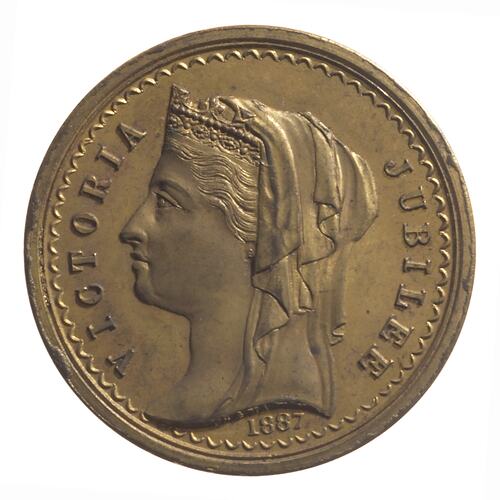 Crowned and veiled head of Queen Victoria left; around, VICTORIA JUBILEE 1887 In small letters on neck, STOKES & MARTIN