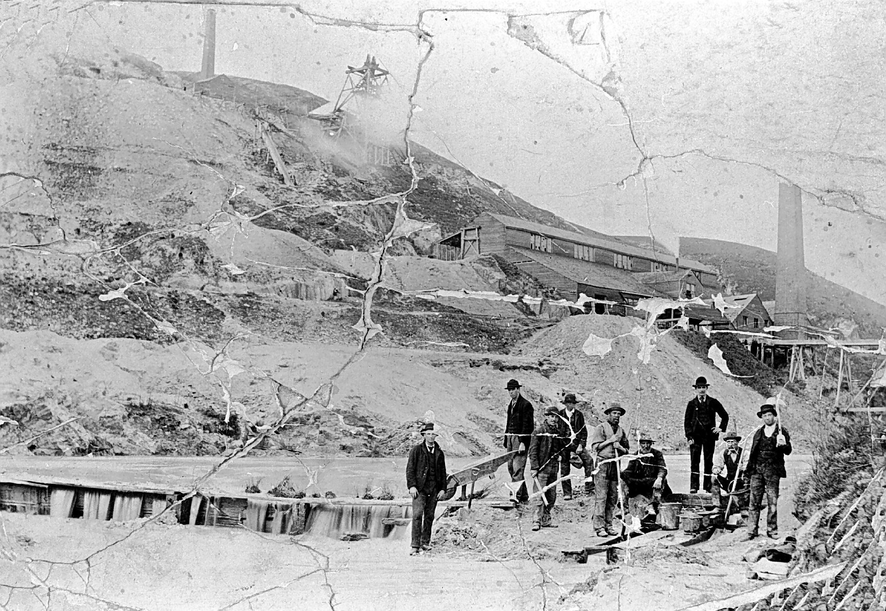 Mining and sluicing at the foot of Black Hill. (The photograph has been badly torn or creased).