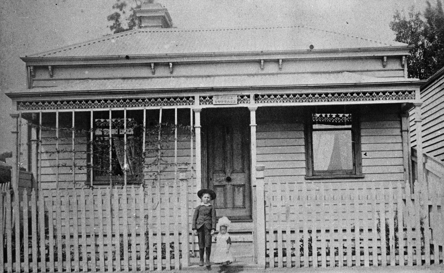 A young boy and a small girl standing at the gate of a small house. The name 'Ethel' appears above the verandah. There are stakes at the left side of the verandah and a vine is being trained upon them.