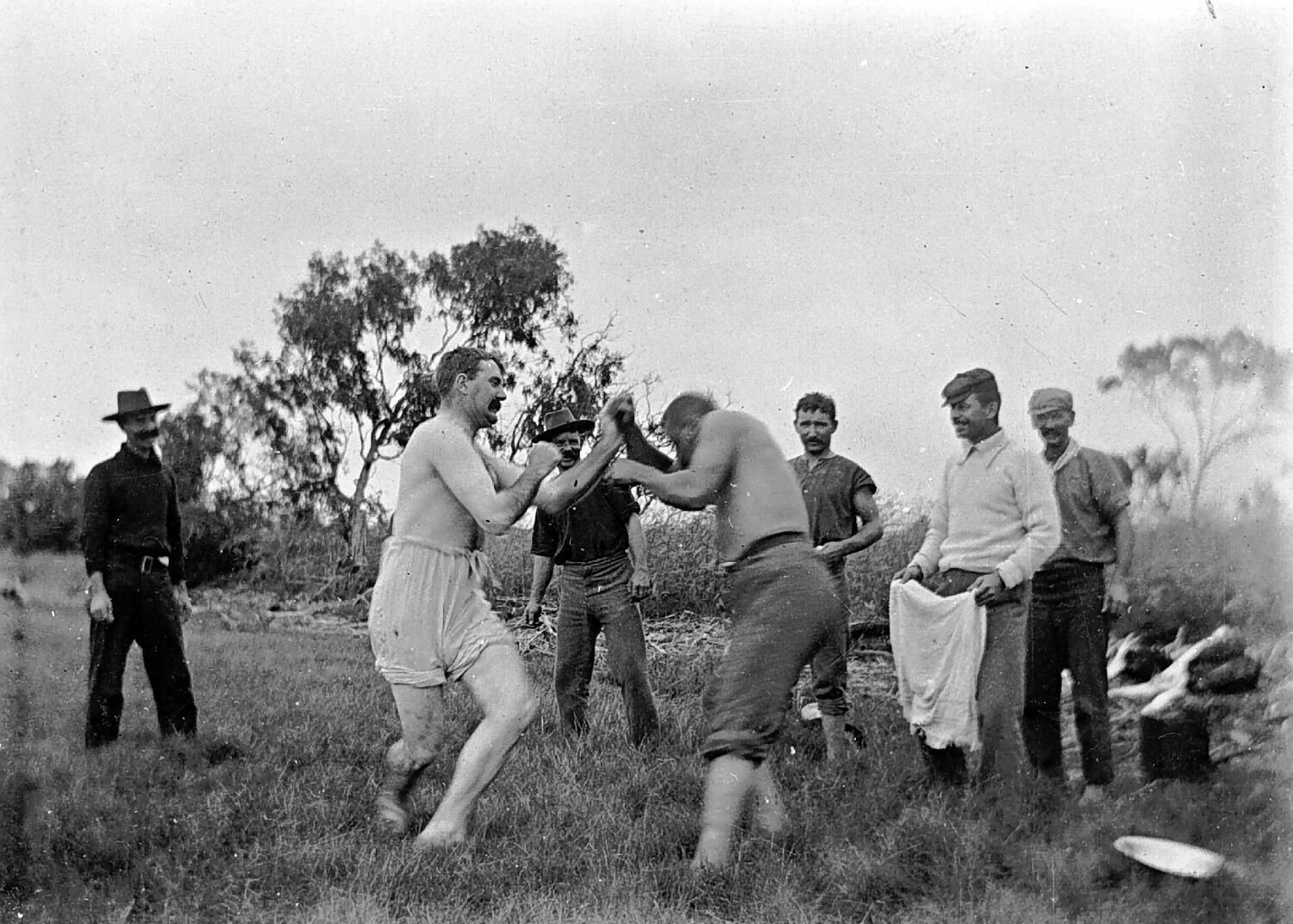 A bare-knuckle boxing match at a camp site.