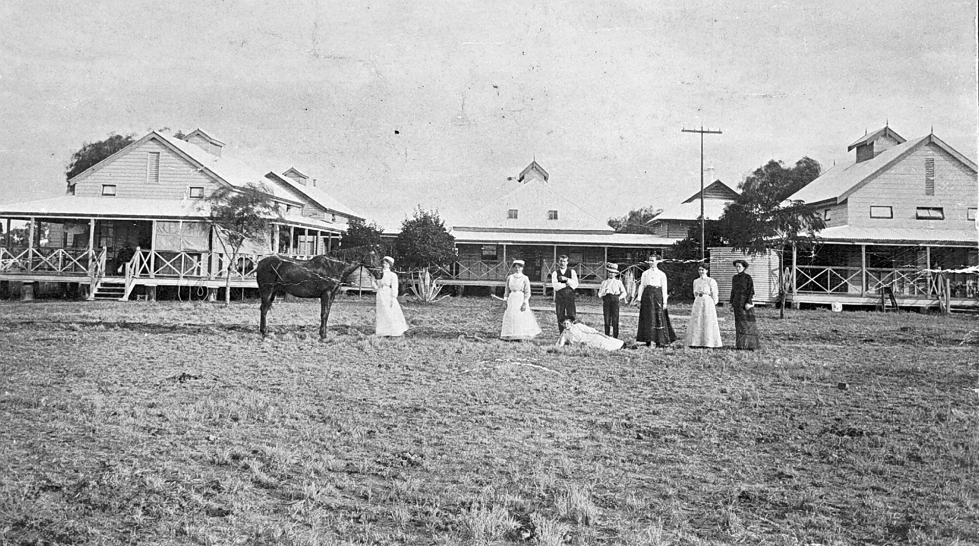 Eight people, one holding a horse, in front of the Mt Morgan Hospital. Three of the women are in nurses uniforms.