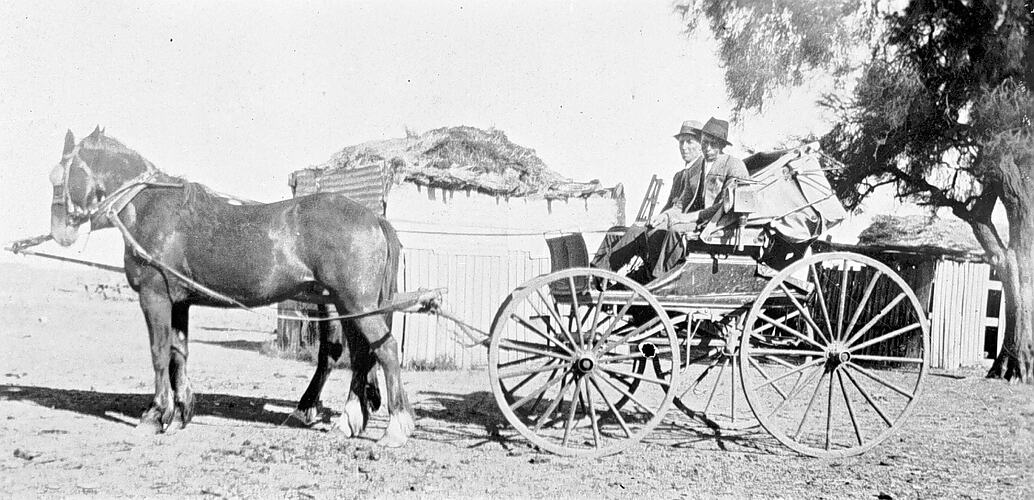 Two men in a horse-drawn buggy. There are farm outbuildings in the background.