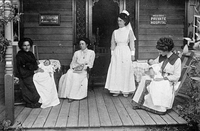A nurse, three women and two babies on the verandah of a private hospital. A sign by the door reads 'Mrs Simpson, ladies nurse'.