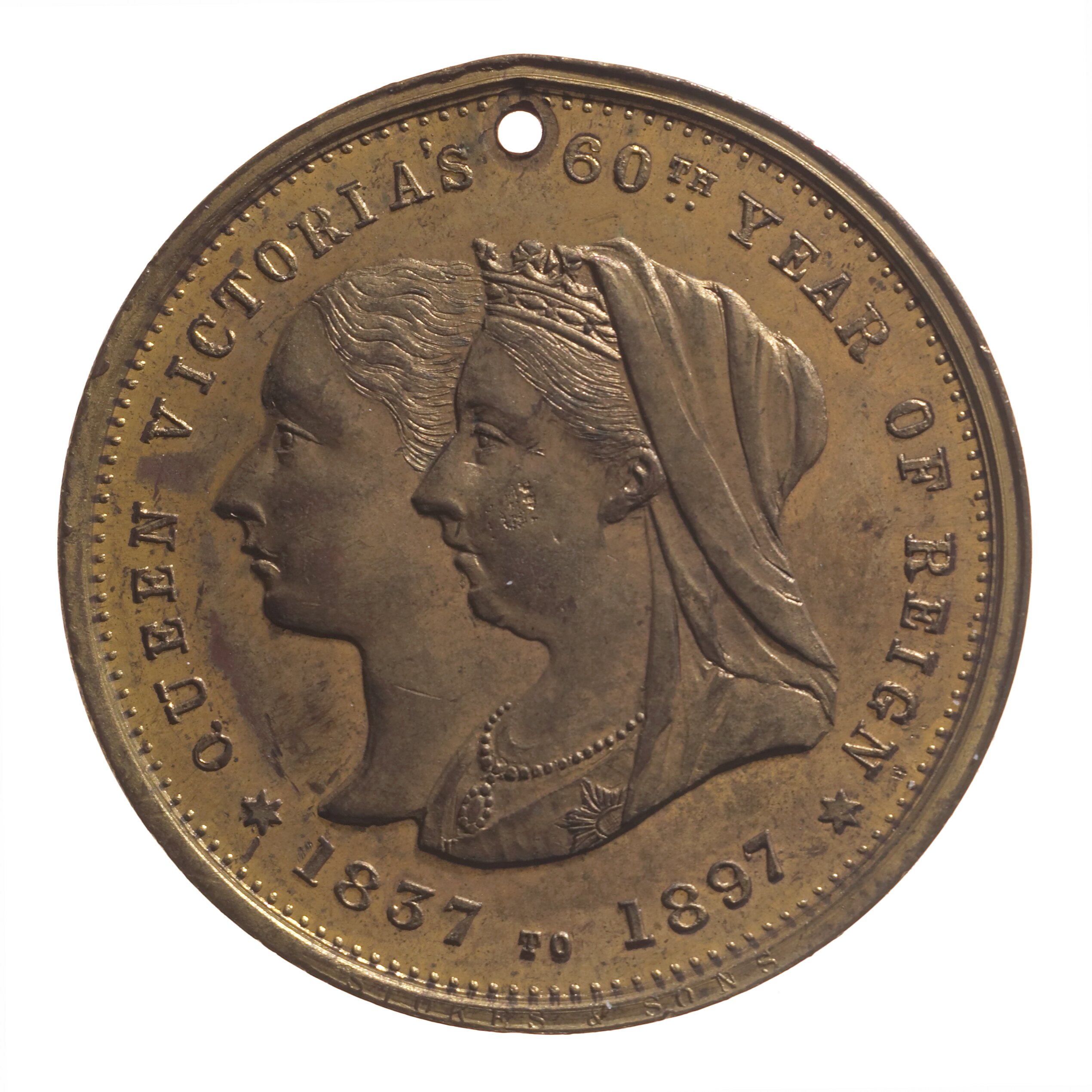Conjoined young head and veiled bust of Queen Victoria left, around, QUEEN VICTORIA'S 60TH. YEAR OF REIGN * 1837 TO 1897 * At edge near 06, STOKES & SONS
