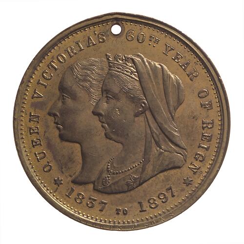Plain (edge) Conjoined young head and veiled bust of Queen Victoria left, around, QUEEN VICTORIA'S 60TH. YEAR OF REIGN * 1837 TO 1897 * At edge near 06, STOKES & SONS (obverse) Within diamond Australian arms, above crown; below, 1897; around, DIAMOND JUBILEE * AUSTRALIA'S CELEBRATION * (reverse stars small, cf. NU21082)(reverse)