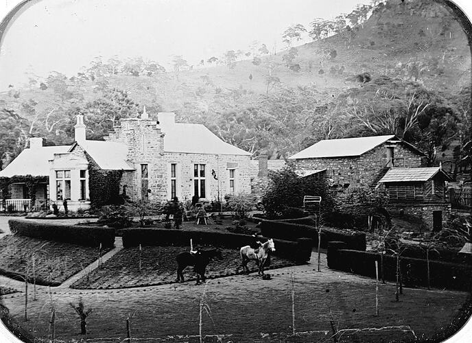 'Ercildoune' homestead and gardens. There is a woman on horseback in the foreground and a second, saddled, horse which does not have a rider.